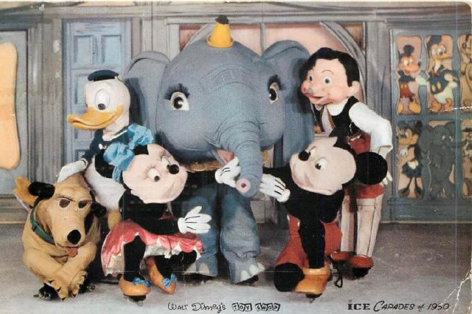 /In 1949, six years before the opening of Disneyland, Mickey and Minnie Mouse and four additional costumed classic Disney characters made their first appearance in Ice Capades, a popular touring entertainment show, in a production number titled “Walt’s Toy Shop”. Six years later when Disneyland’s opening day was fast approaching, Walt Disney reached out to the operators of Ice Capades with a request to borrow their Mickey and Minnie costumes. Videos and home movies from the July 17, 1950, opening day show the not-so-loveable Ice Capades characters in black leotards, shorts and oversize papier-mâché heads with the creepy eye holes cut out. Evolution of Disneyland’s characters was slow and it wasn’t until the early 1960’s that Walt Disney created a dedicated Character Department formed to develop appealing and comfortable costumes focusing on character accuracy and the performers’ safety. Ice Capades thrived for the next five decades gaining in popularity, changing ownership, and growing into three separate touring companies featuring theatrical ice skating performances by former Olympic and US National figure skater champions.